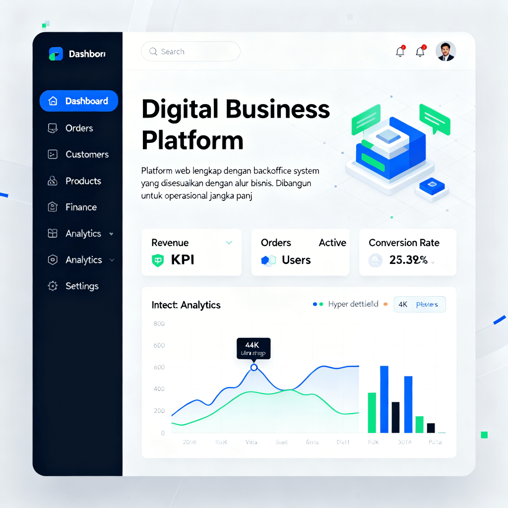 Platform web lengkap dengan backoffice system yang disesuaikan dengan alur bisnis. dibangun untuk operasional jangka panjang.